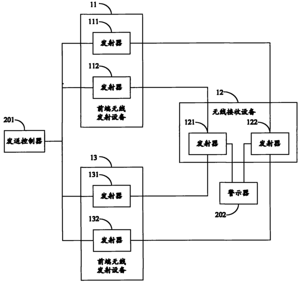本實用新型實施例公開了無線安防報警系統和裝置。其中,無線安防報警系統包括前端無線發射設備和無線接收設備,前端無線發射設備包括多個在發生警情時發送報警信號的發射器,任一發射器所發送報警信號的頻率與其他發射器所發送報警信號的頻率處于不同頻段;無線接收設備包括與多個發射器一一對應的多個接收器。可見,本實用新型實施例中任一發射器-接收器所工作的頻段與其他發射器-接收器所工作的頻段均不相同。當工作于某個頻段的接收器遭受同頻干擾或鄰頻干擾時,其他頻段的接收器還可與對應的發射器保持正常通訊,從而解決了現有的、只使用單一頻段的無線安防報警系統因受到同頻干擾或鄰頻干擾而導致的漏報警問題。