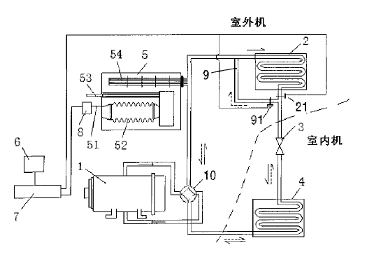 本發明公開了一種制冷、制熱的雙能源燃氣熱泵空調系統及運行方法,包括熱泵系統,還包括一真空鍋爐換熱裝置、一溫度傳感器、以及一切換電路;真空鍋爐換熱裝置設置在室外,通過管道連接在熱泵系統的壓縮機和第一熱交換器之間,與其他部件處于同一循環系統中;溫度傳感器設置在室外,該溫度傳感器的輸出端與切換電路的輸入端電連接;切換電路根據溫度傳感器輸出的溫度信號控制真空鍋爐換熱裝置和第一熱交換器的交替啟閉。當室外溫度降到設定溫度以下時,真空鍋爐裝置制熱,從而徹底解決了普通熱泵系統在冬天低氣溫的時候室外機從空氣中吸熱效率低下、以及結霜導致系統無法運行的問題。具有效率高、制熱效果好和降低用電高峰時電力系統的壓力的優點。