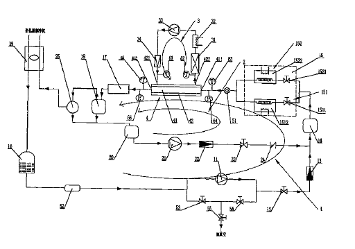 本發明涉及一種管內制冷劑含油蒸發/冷凝傳熱測試一體裝置及其測試方法,裝置的特征是包括通過管道順序連接的冷凝器、回收罐、動力泵、調節閥、制冷劑質量流量計、均勻調和槽、蒸發預熱/冷凝預熱并聯選擇通路、蒸發/冷凝測試段、加熱器、高效油分離器、冷凝器的制冷劑回路;通過管道順序連接的高效油分離器、貯油器、高壓油泵、潤滑油質量流量計、控制閥、均勻調和槽、蒸發預熱/冷凝預熱并聯選擇通路、制冷劑蒸發/冷凝測試段、加熱器、高效油分離器的潤滑油注油回路;以及通過管道順序連接的換熱器、水加熱器、水泵、水質量流量計的蒸發/冷凝測試段換熱回路。可進行不同制冷劑管內蒸發冷凝傳熱測試和制冷劑含油率對換熱管蒸發冷凝傳熱特性影響測試,方便、可靠。