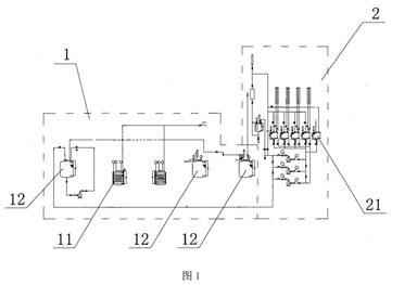 10 實用新型 廢酸回收利用系統 本實用新型公開了一種廢酸回收利用系統,該系統由廢酸儲存單元(2)與廢酸再生單元(1)組成,其中廢酸儲存單元(2)中包含若干儲存罐(21)與至少一個過濾罐,過濾罐與廢酸排放管道相連通,儲存罐(21)通過管道相互連通;所述的廢酸再生單元(1)中包含再生裝置、至少一個混酸罐(11)與新酸儲存罐(12),新酸儲存罐(12)與回收管道相連通,再生裝置與混酸罐(11)相連通。從廢酸管道中排出的廢酸溶液直接進入過濾罐,將混酸過濾后進入儲存罐中儲存,隨后依次進入混合罐中通過再生裝置反應完成后隨回收管道回收再次利用,依次循環,使用成本較為低廉,可用于廢酸或混酸的回收利用,應用范圍廣。