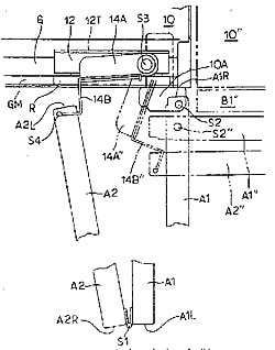25 實用新型 門的開關機構 本發明提供可以把折疊式門打開大于90度角的門的開關機構。柜體(10)形成的開門部位至少有要開關一部分的相鄰的兩扇門A1、A2,以上下方向的第1軸S1為中心連結在一起,并可以相互轉動,一扇門A1具有以遠離上述第1軸一側A1R附近上下方向的第2軸S2為中心與柜體連結,并能相對柜體轉動的折疊式門A,以及沿柜體開口部位左右方向移動的移動件12,以上下方向的第3軸S3為中心與上述移動件連結,并能相對上述移動件轉動的轉動部件14A、14B。上述折疊式門的另一扇門A2以在遠離上述第1軸一側A2L附近的第4軸S4為中心,連結上述轉動部件,并可以相互轉動。