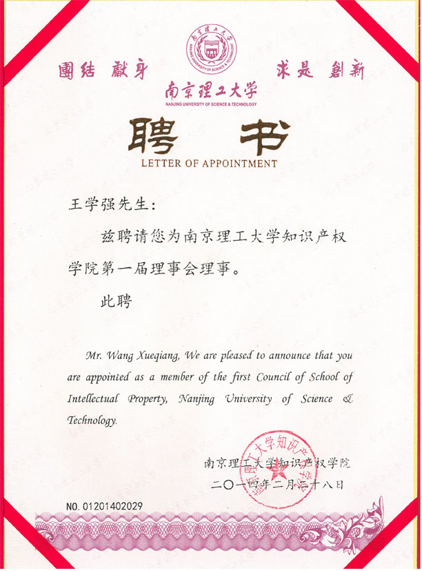 集佳合伙人王學強受聘為南京理工大學知識產權學院首屆理事會理事