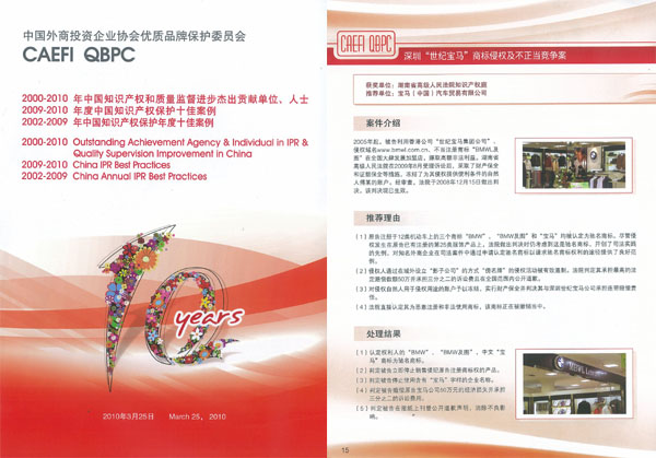 2010年3月25日,在隆重的中國外商投資企業協會優質品牌保護委員會成立十周年慶典上,由集佳代理的寶馬股份公司訴深圳市世紀寶馬服飾有限公司(以下簡稱“世紀寶馬”)等商標侵權及不正當競爭一案榮登品保委2009-2010年度中國知識產權保護十佳案例。