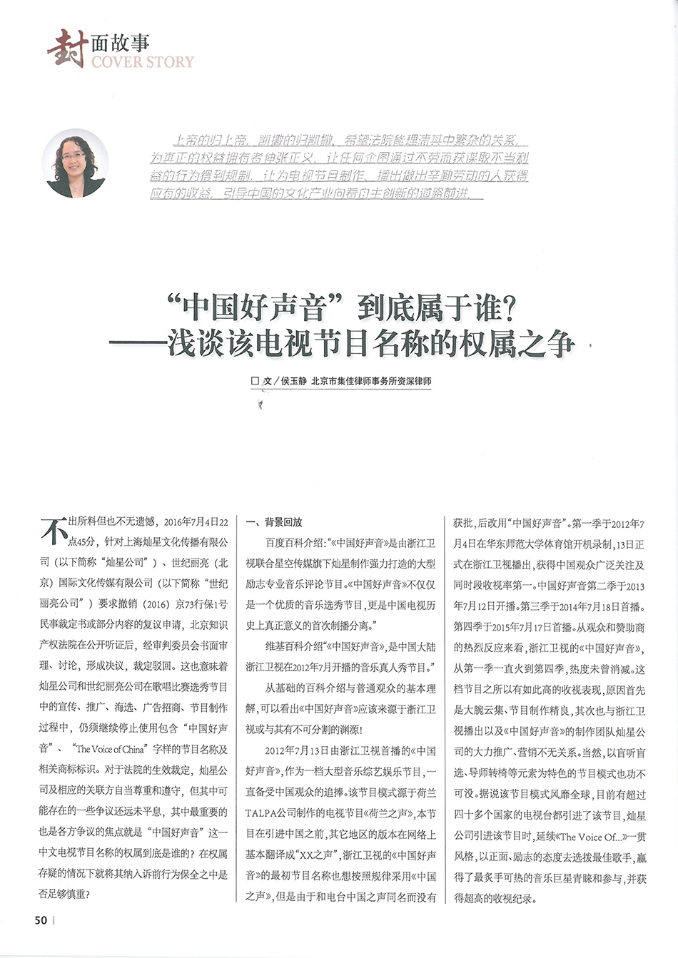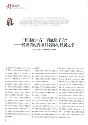 集佳資深律師侯玉靜文章《“中國好聲音”到底屬于誰?——淺談該電視節目名稱的權屬之爭》在《中國知識產權》發表