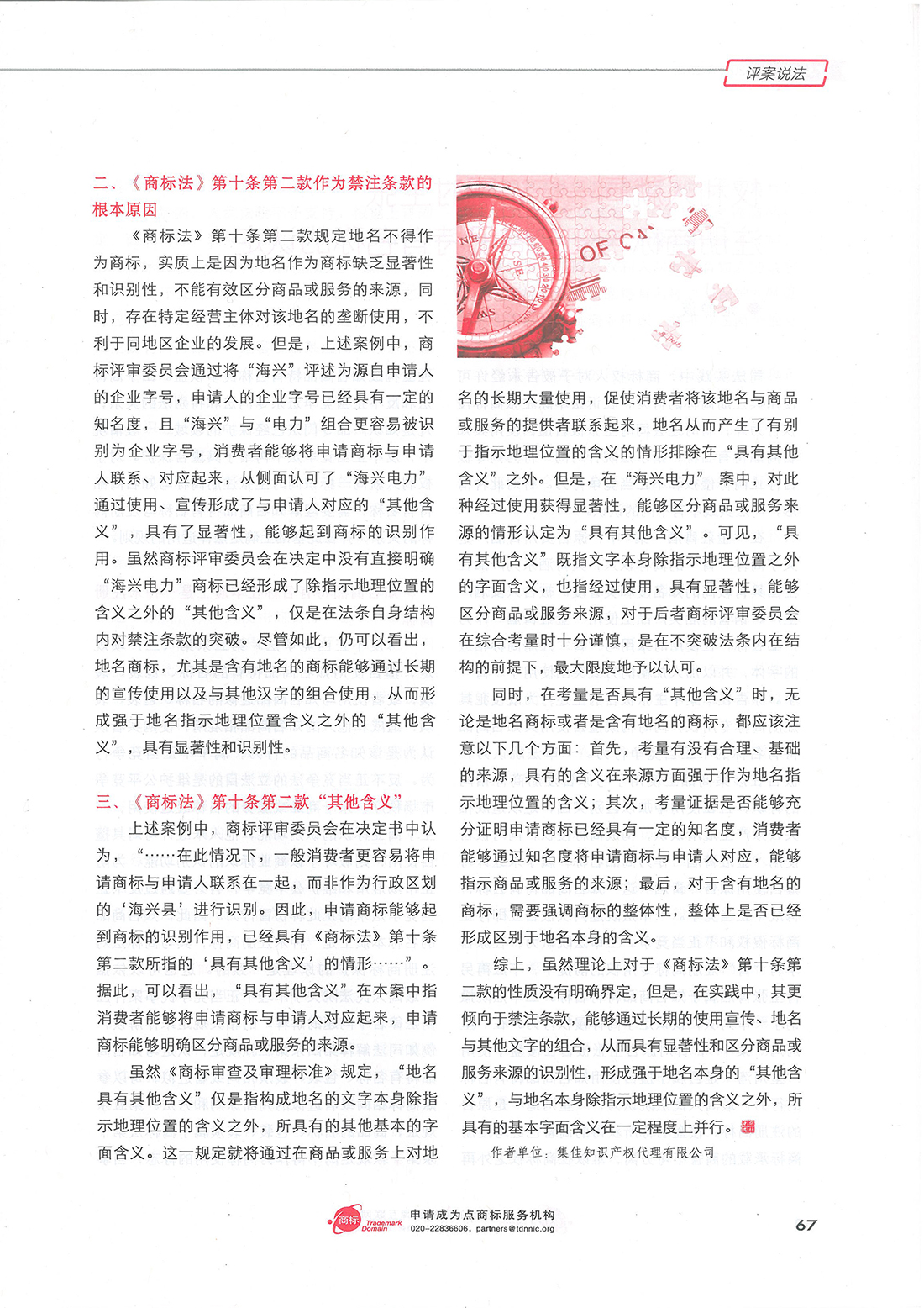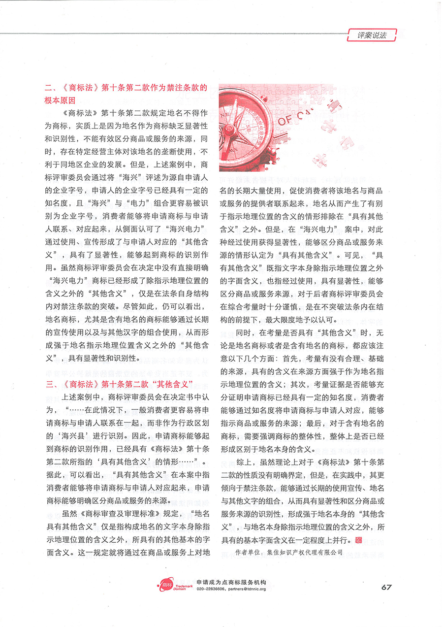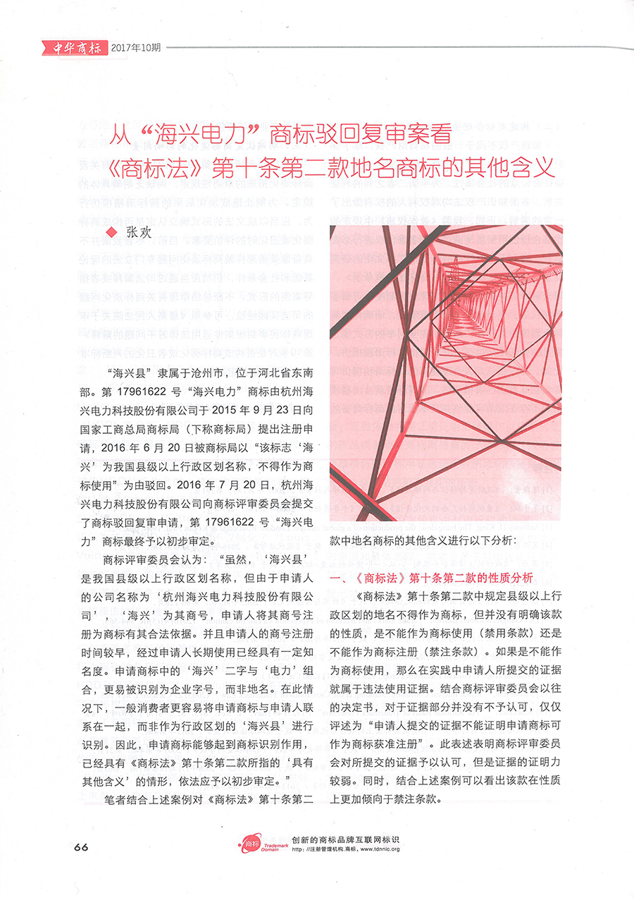 集佳文章《從“海興電力”商標駁回復審案看<商標法>第十條第二款地名商標的其他含義》在《中華商標》發表