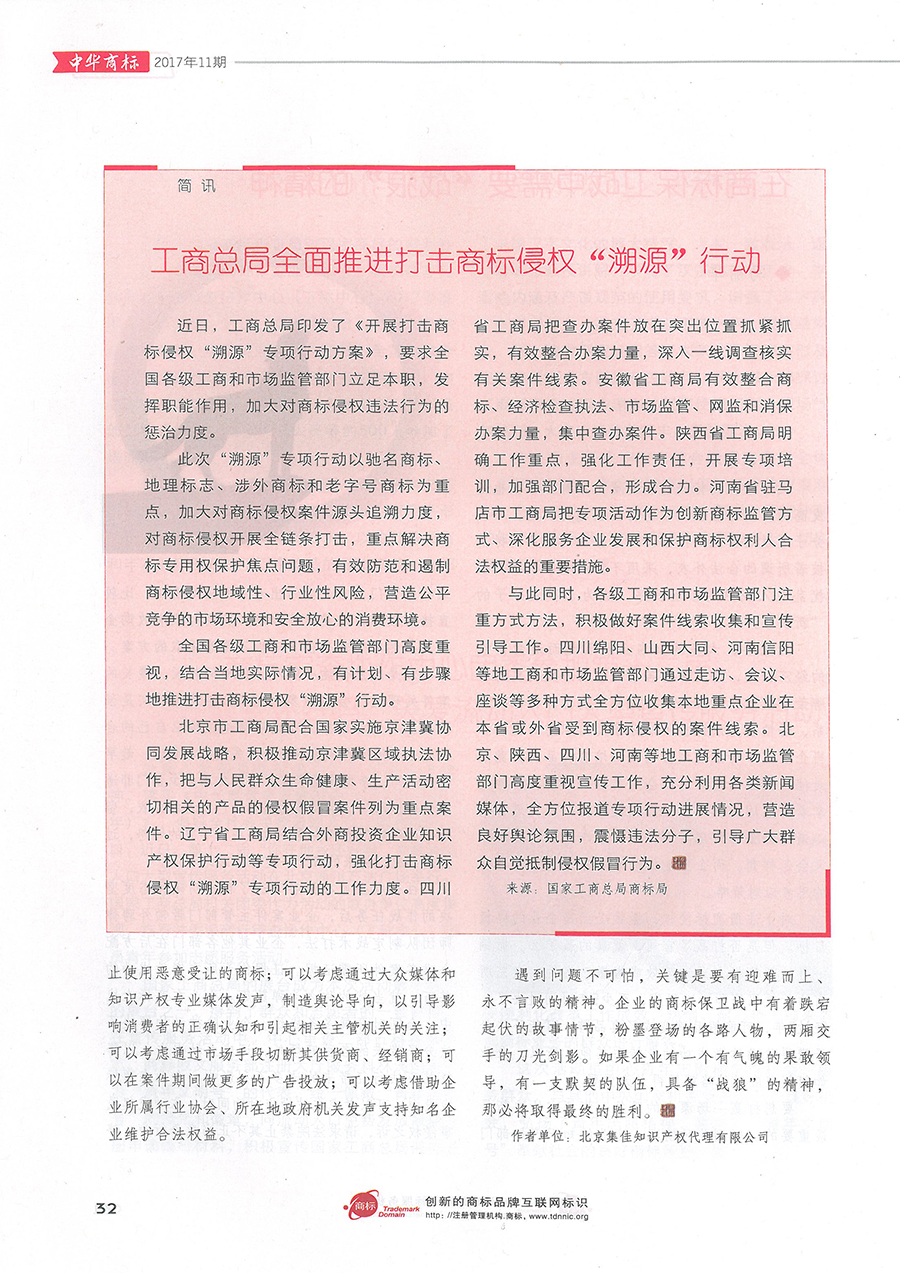 集佳文章《在商標保衛(wèi)戰(zhàn)中需要“戰(zhàn)狼”的精神》在《中華商標》發(fā)表