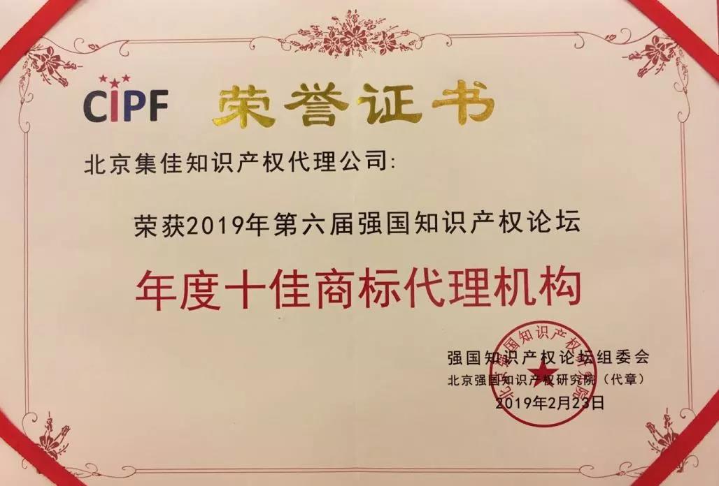 集佳獲2019第六屆強國知識產權論壇“十佳商標代理機構”榮譽稱號