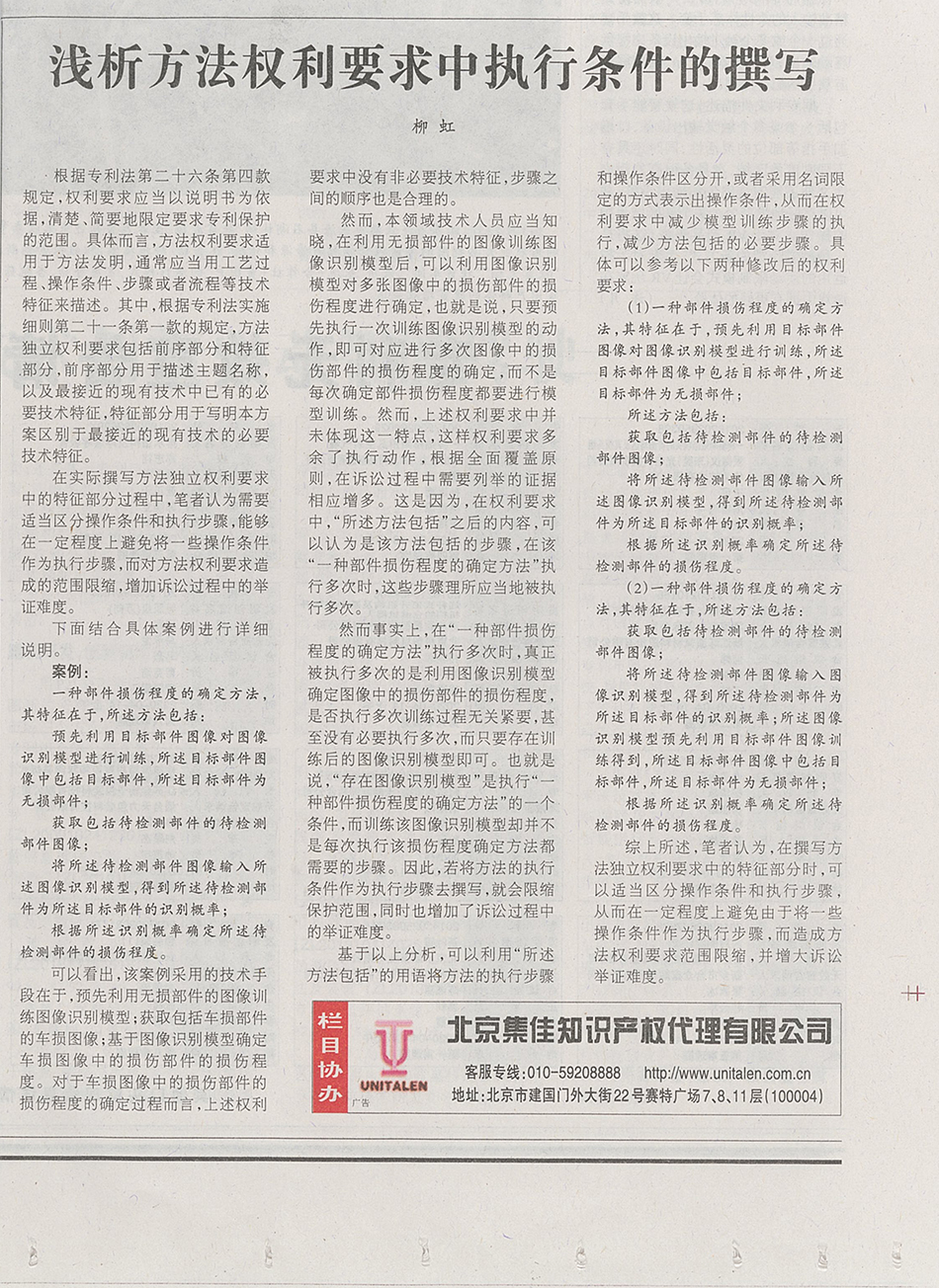 集佳文章《淺析方法權利要求中執行條件的撰寫》在《中國知識產權報》發表