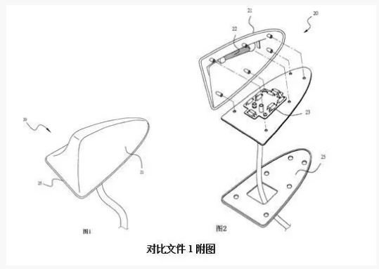 該專利的權利要求1內容為“一種鯊魚鰭式天線,其特征在于具有天線外殼,天線外殼內側上部設置有無線電接收天線,無線電接收天線一端設有天線信號輸出端,天線信號輸出端通過天線連接元件與天線放大器信號輸入端相連接,或直接與同軸電纜匹配相連,天線外殼底部裝有安裝底板;所述無線電接收天線通過注塑嵌裝或固定卡裝在天線外殼內側上部;在天線外殼內側上部設置有無線電接收天線,所述無線電接收天線采用螺旋狀彈簧天線、或金屬天線,增加了天線接收無線電信號的有效長度,實現360度全向性信號接收;所述無線電接收天線為AM/FM共用天線。”