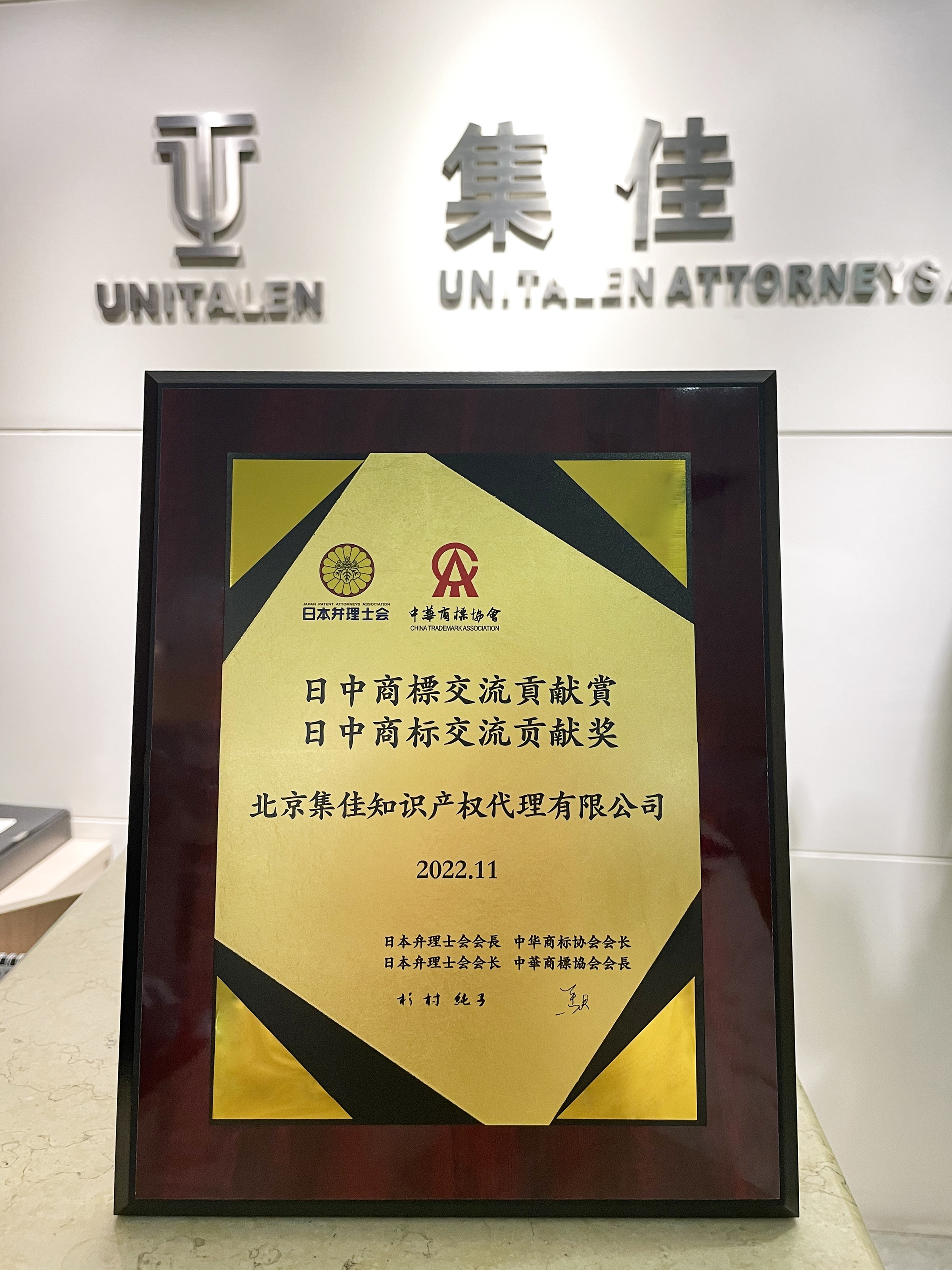 2022年11月11日,“中華商標協會(CTA)&日本弁理士會(JPAA)合作二十周年紀念活動”在北京和日本東京以視頻會議形式成功舉辦。集佳于澤輝所長作為“中日商標交流貢獻獎”獲獎單位代表受邀參加本次活動。