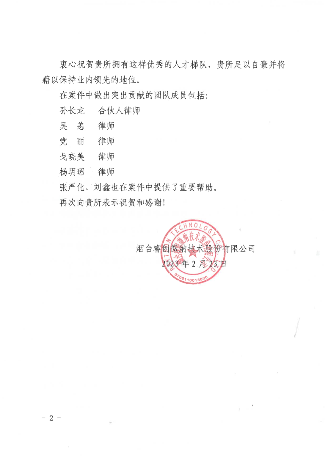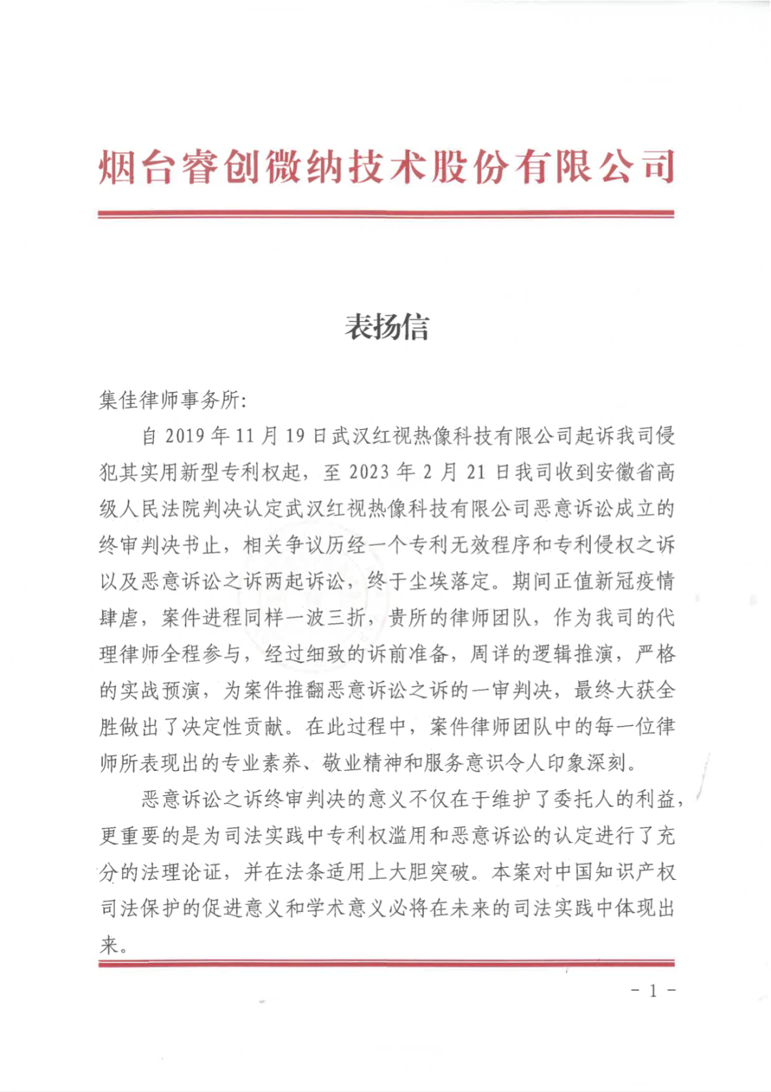 圖1 睿創集團向集佳律所寄送的表揚信