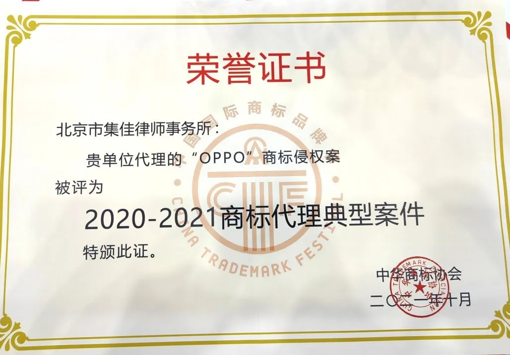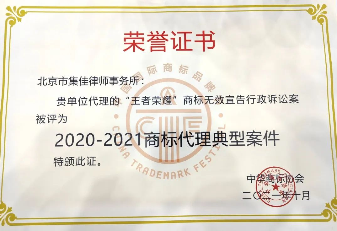 6月17日,第十三屆中國國際商標品牌節正式拉開帷幕,各項活動火熱進行。在“商標典型案例評析論壇”上,集佳律師事務所代理的“第33類‘王者榮耀’無效宣告行政訴訟案”和“OPPO侵權案”因其體現出的創新性、實效性、典型性和影響力,在眾多案例中脫穎而出,雙雙入選“2020-2021商標代理典型案件”。