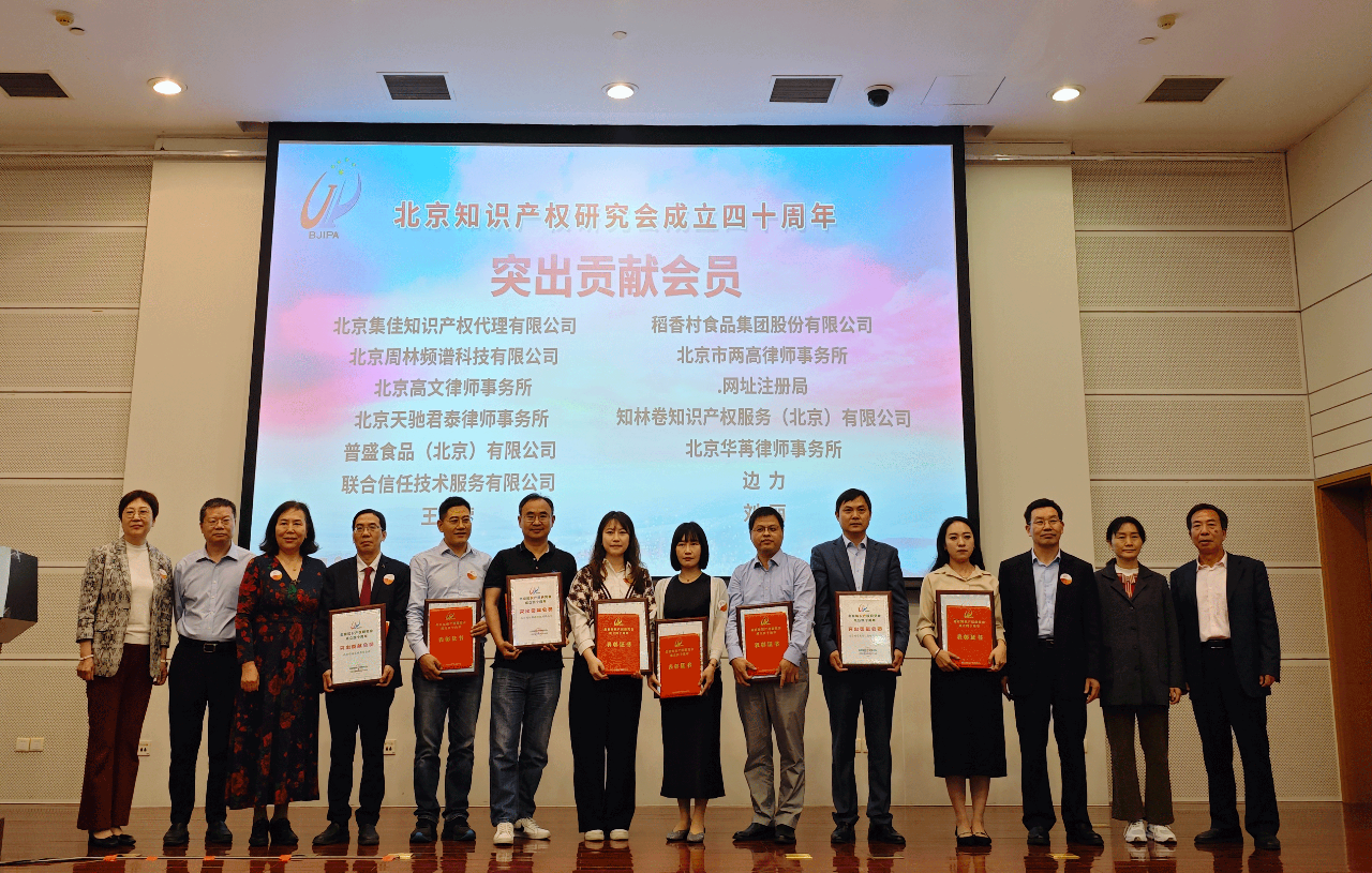 2024年4月27日,北京知識產權研究會成立四十周年慶典暨數字經濟與知識產權論壇隆重召開。在慶典儀式上,北京知識產權研究會會長、北京航空航天大學教授孫國瑞向在研究會工作中做出突出貢獻的個人和機構頒發了榮譽牌匾,北京集佳知識產權代理有限公司獲評“突出貢獻會員”榮譽稱號。