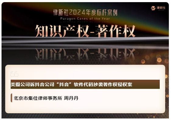 北京市集佳律師事務所憑借在知識產權保護領域卓越的專業實力與良好的行業口碑,入選《律所卓越品牌影響力指南(2024)》,榮獲“律新社2024年度精品品牌律所30佳”獎項;同時,集佳周丹丹律師代理的“美攝公司訴抖音公司'抖音'軟件代碼抄襲著作權侵權案”獲評“律新社2024年度標桿案例:知識產權-著作權領域”。